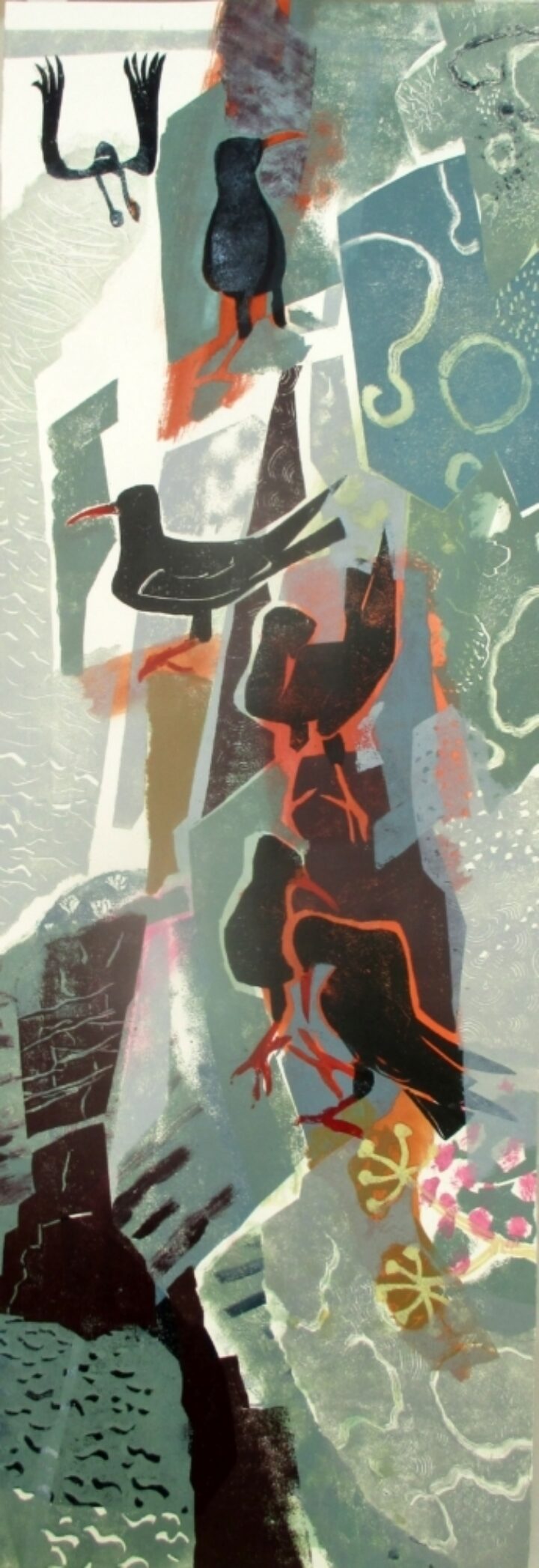 Mae'r gwaith yn y stiwdio yn aml yn cynnwys mwy nag un cyfrwng. Monoprint yw'r dull ble mae inciau olew seiledig yn cael eu trosglwyddo o gardyn neu Perspex, sydd yn arwain at naenliwio, llinellau crafedig, ansoddau od.