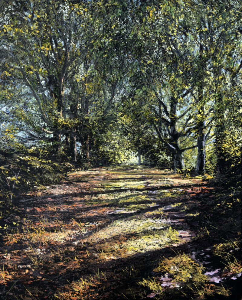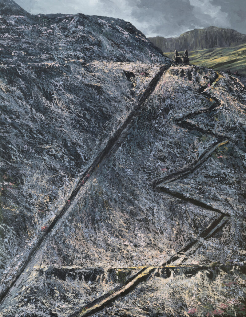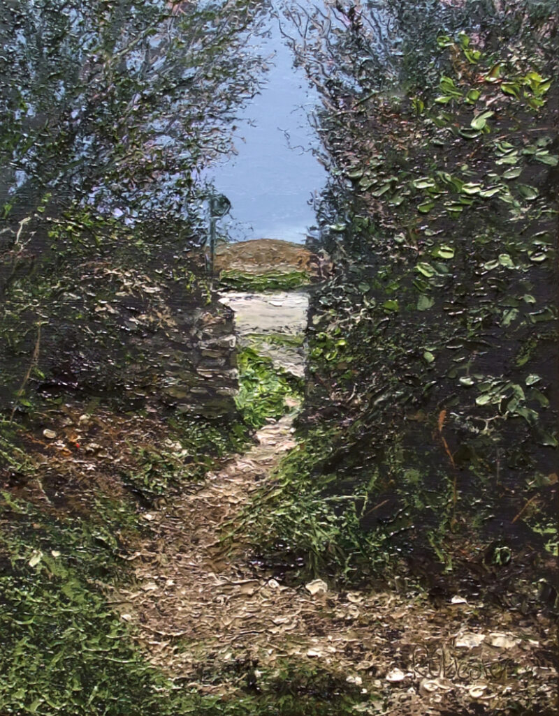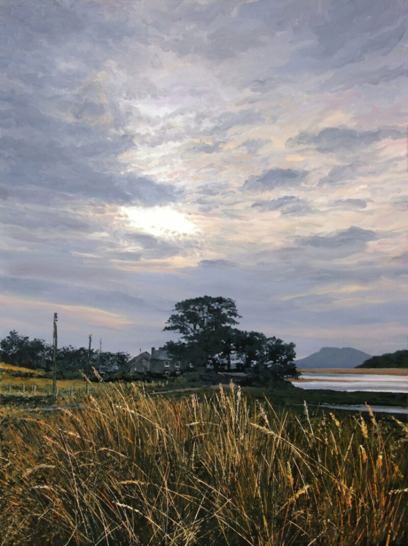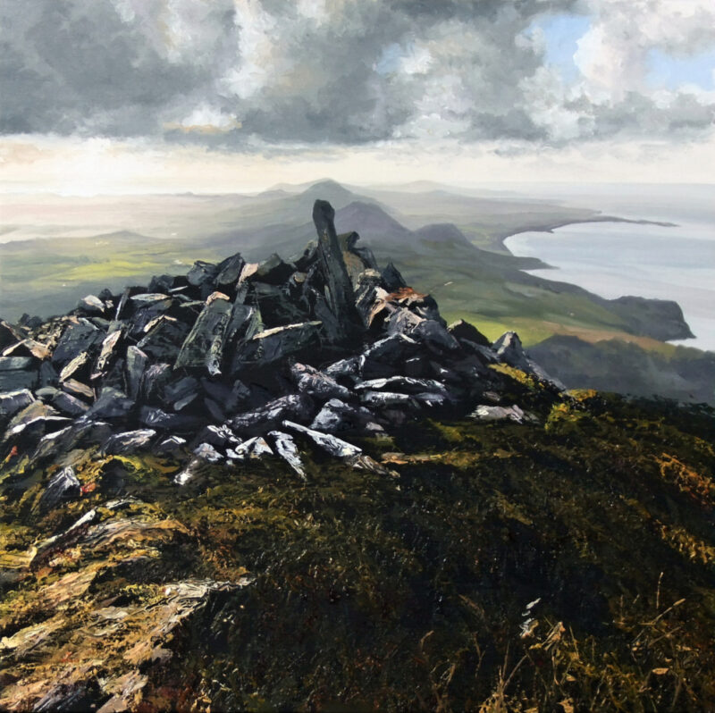 Yn ail, er mai fy mwriad oedd darlunio Enlli o bob agwedd, drwy gydol y tymhorau, ac mewn amrywio amodau goleuni a naws, daeth i'm meddwl yn fuan nad yw'r lle yn ymwneud â'r dirwedd na'r lleoliad yn unig, ac roedd angen i mi fod yn fwy eang a chynhwysol yn fy mhortread. Arweiniodd hyn fi allan o fy mharth cysurlon mewn sawl ffordd; dydw i ddim yn arlunydd bywyd gwyllt, ond byddai anwybyddu'r pwnc hwn bron yn anfaddeuol! Dewisais hefyd ymgorffori ffigurau yn un o fy mhaentiadau i gynrychioli'r naratif dynol a rôl gyfredol pererindod - a roddodd broblem arall i mi yn anfwriadol - sut ydw i'n cynnwys y cyfraniad sylweddol y mae crefydd wedi'i chwarae dros y canrifoedd heb ddefnyddio symbolaeth amlwg? Roedd yr ateb ychydig yn anghonfensiynol ac yn eithaf cymhleth yn ei greu, gan ddefnyddio technegau a dulliau cwbl newydd i mi; gyda'r enw 'Enlli' wedi'i addurno'n syml yn null llawysgrif ganoloesol.