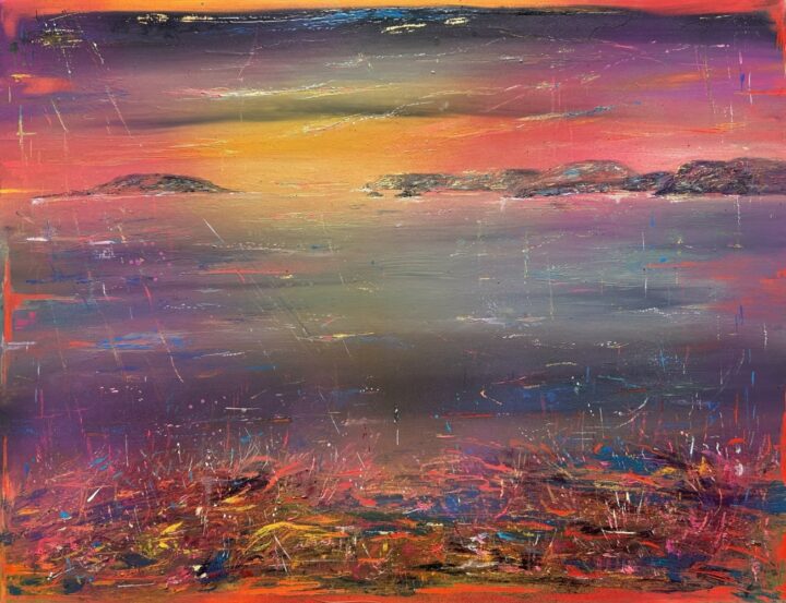 Meddai Elin: “Byddaf yn ail-greu llinellau, ffurfiau a ffiniau tir, môr ac awyr. Nid trosiad llythrennol mohonynt ond myfyrdodau ac atgofion o’r synnwyr o le. Boed yn waith lluniadu neu wehyddu datblyga’r gwaith mewn modd organig sydd yn gadael ôl fy llaw drwy grafu’r haenau yn y gwaith lluniadu ac amrywio tyndra’r gwlân yn y gwaith gwehyddu. Rwyf yn mwynhau’r gwrthdaro rhwng natur lafurus, ailadroddus gwehyddu a chyflymdra bywyd cyfoes.”