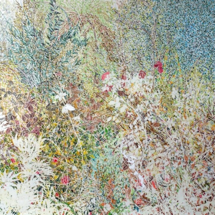 'These paintings are a representation of a residency/project that began in the Spring of 2019 up to the present day. My practice has over the course of twenty years focused on observing weeds usually found in Urban environments and using this information to create a variety of works from installations to paintings and working within communities. As such this project involved walking the inland route of the Llyn peninsula and recording the plants through drawings, photos, writings and memory that I encountered along the way.